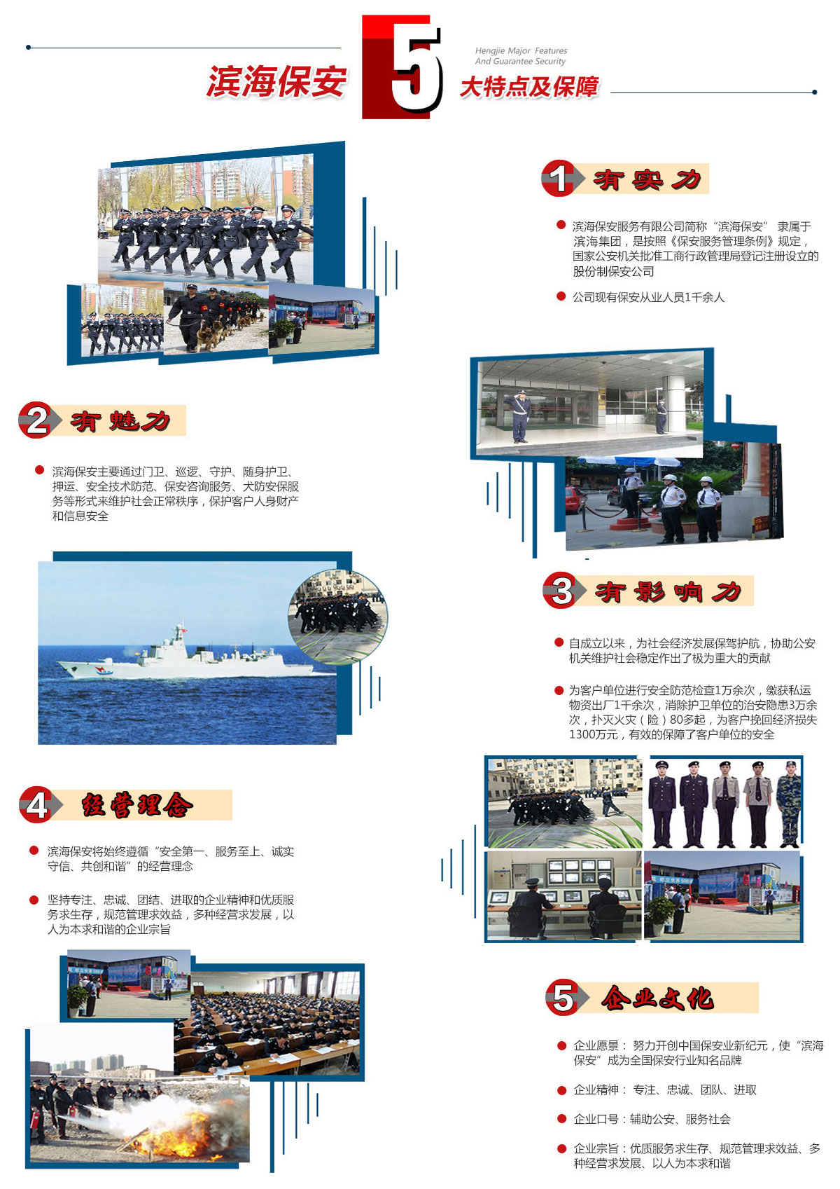 濱海保安主要通過門衛、巡邏、守護、隨身護衛、押運、安全技術防范、保安咨詢服務、犬防安保服務等形式來維護社會正常秩序,保護客戶人身財產和信息安全。公司現有保安從業人員1千余人,客戶單位涵蓋黨政機關、企事業單位、金融機構、高檔寫字樓、賓館飯店、高檔別墅、高等院校、大型商場、建筑行業等,現有單位100余家。